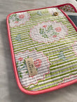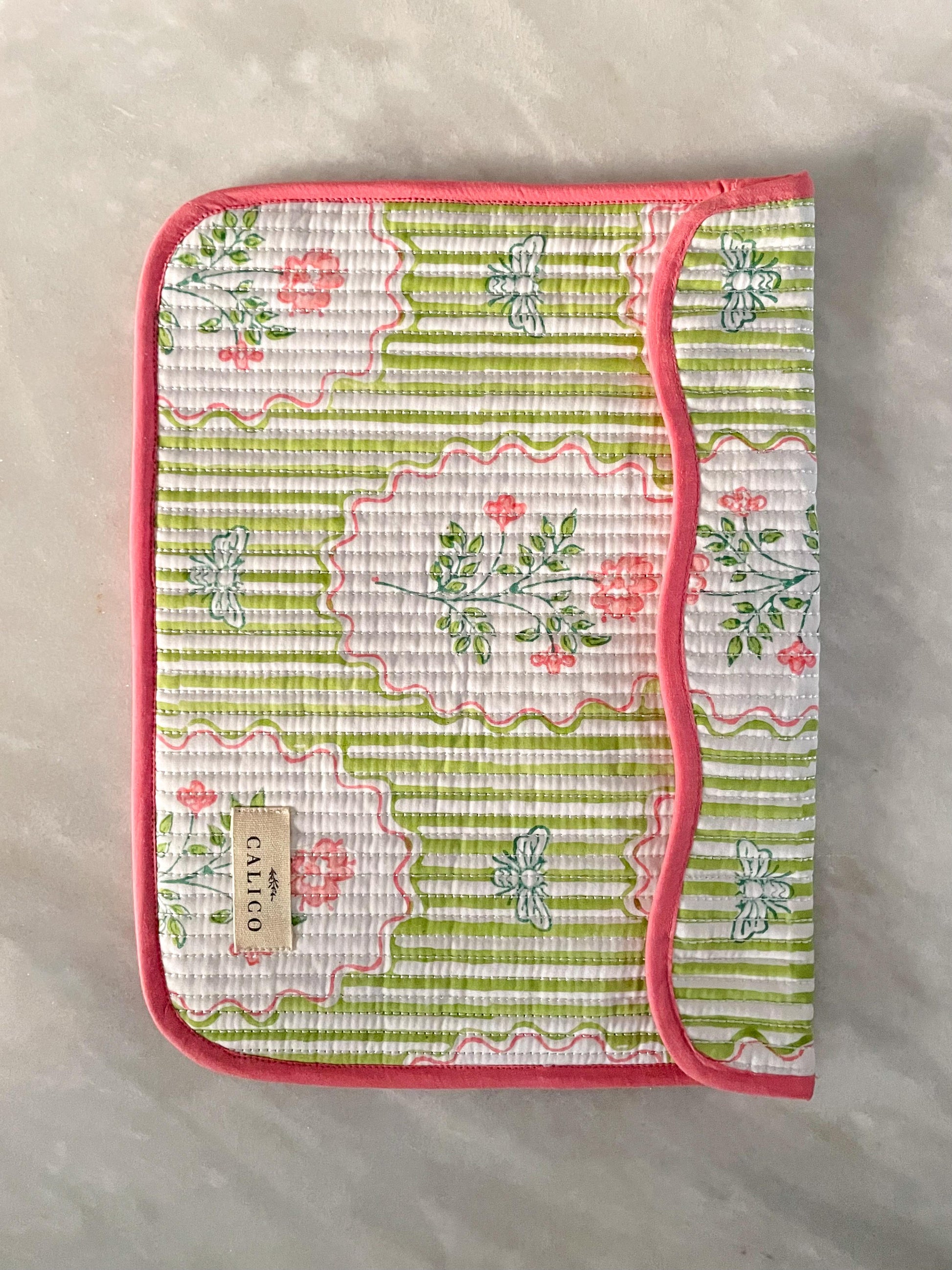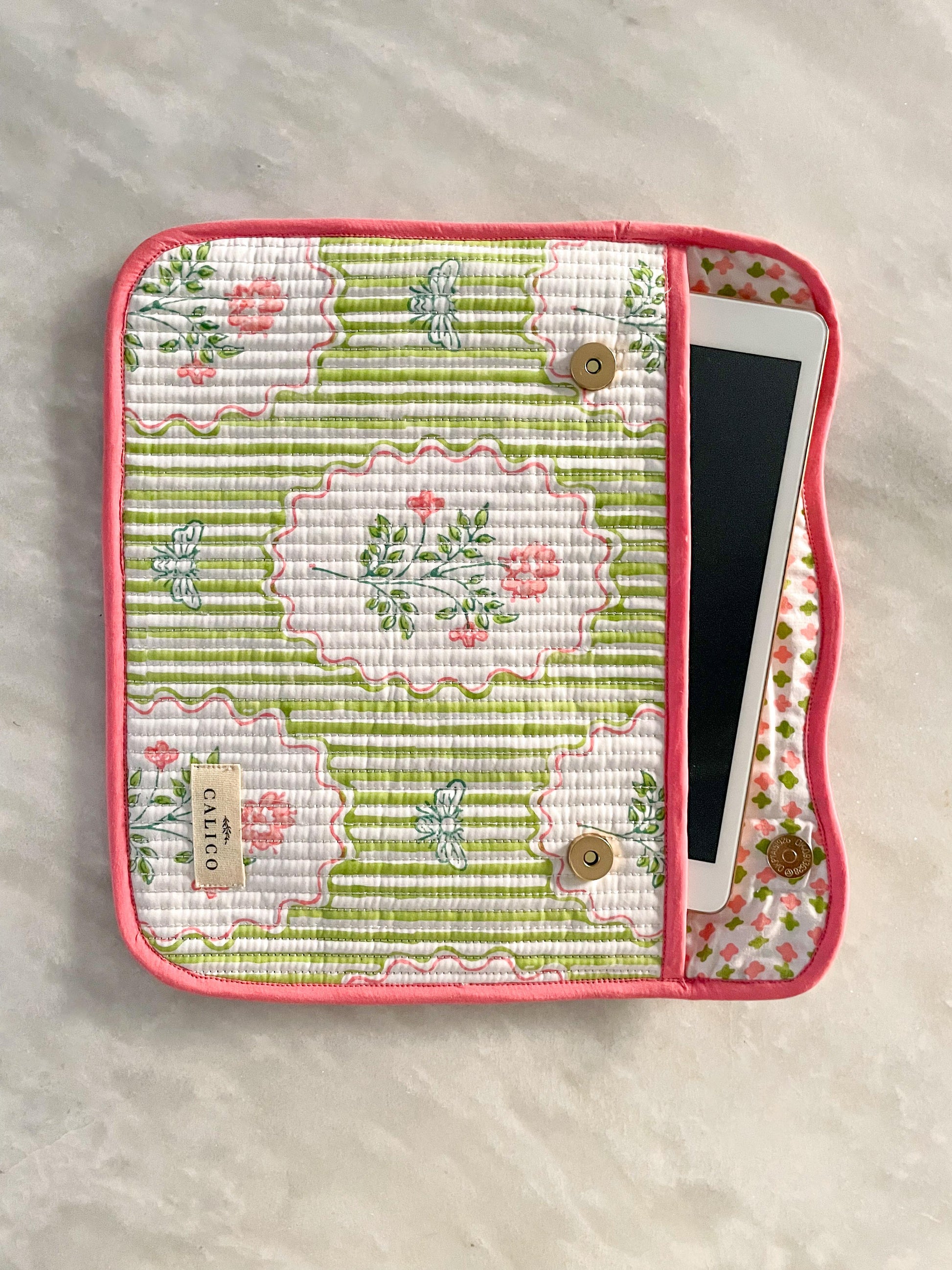 the exterior features a delicate, artisanal print on cotton, while the inside is quilted and padded to provide extra cushioning and protection for your device.