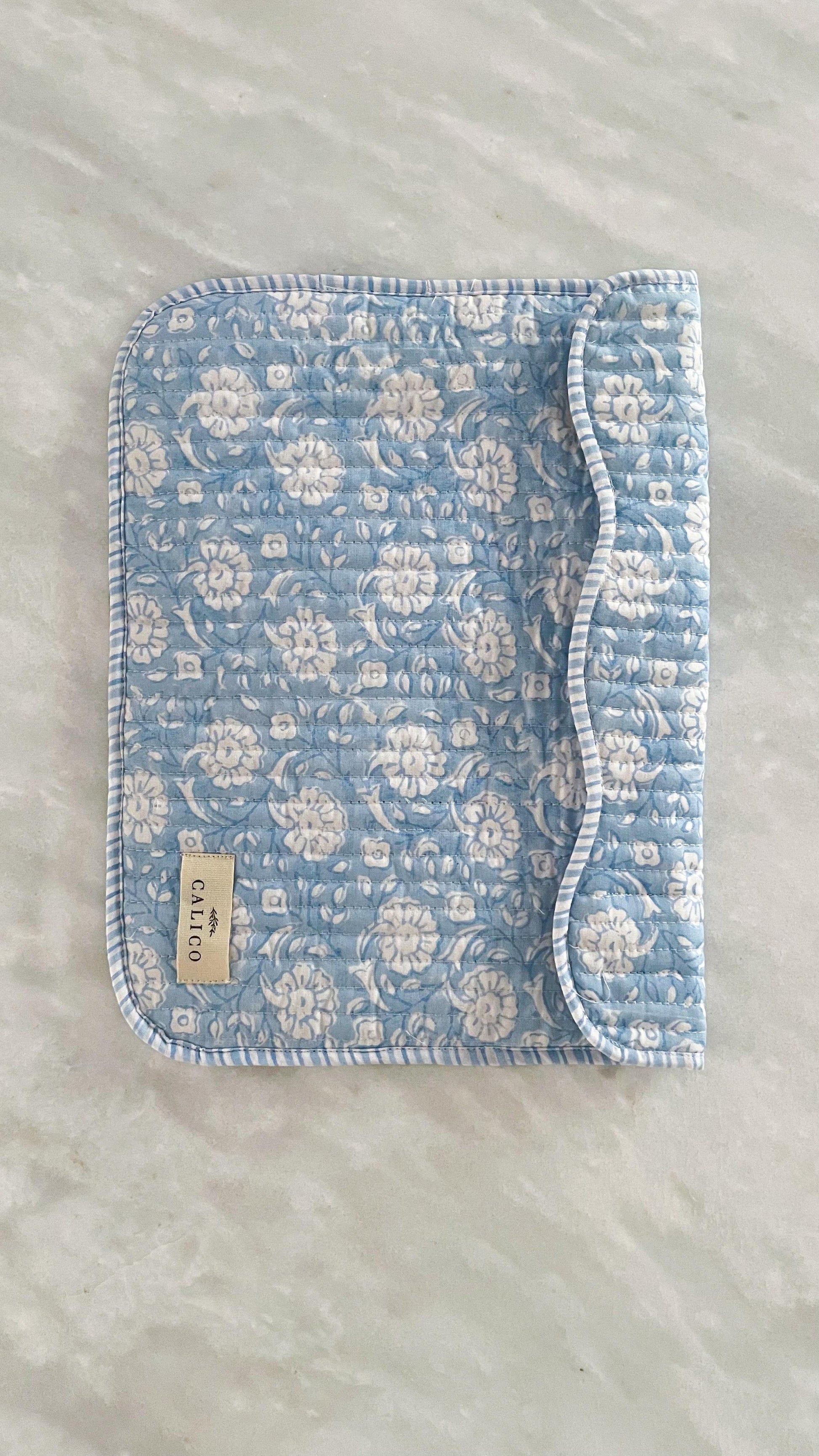 the exterior features a delicate, artisanal print on cotton, while the inside is quilted and padded to provide extra cushioning and protection for your device.