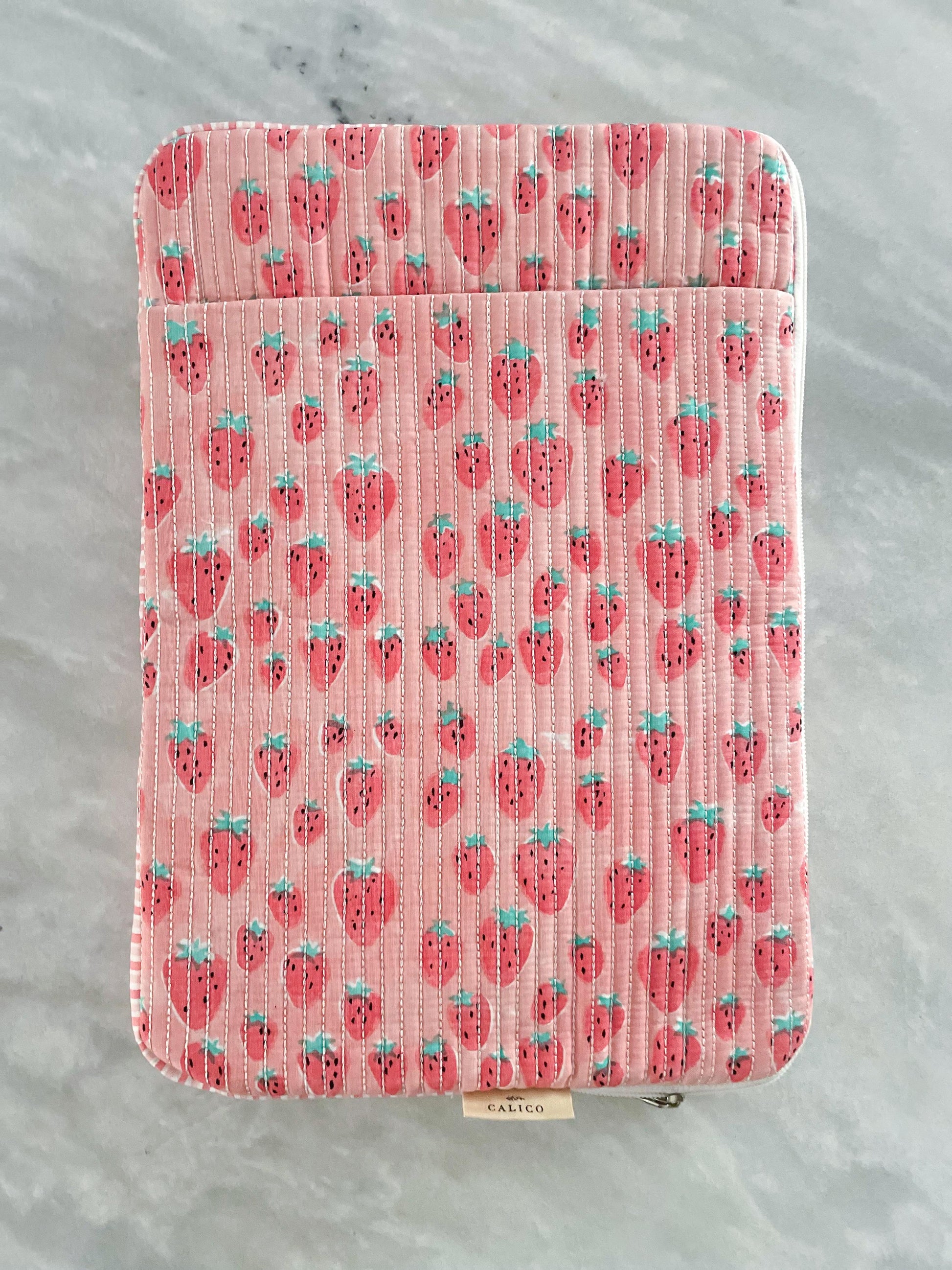 This block-printed quilted laptop sleeve combines style and function. Designed with soft cushioning for added protection, it features a waterproof inner lining to safeguard your device. A convenient front pocket provides extra space for a notebook or charger, making it a perfect everyday essential.