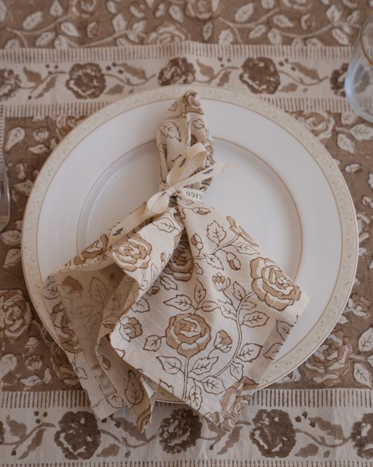 Delicately hand block printed napkins feature a brown floral print on a off white base....