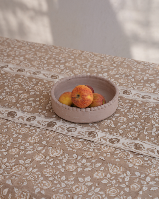 Delicately hand block printed tablecloth featuring muted off white and beige roses on a brown...
