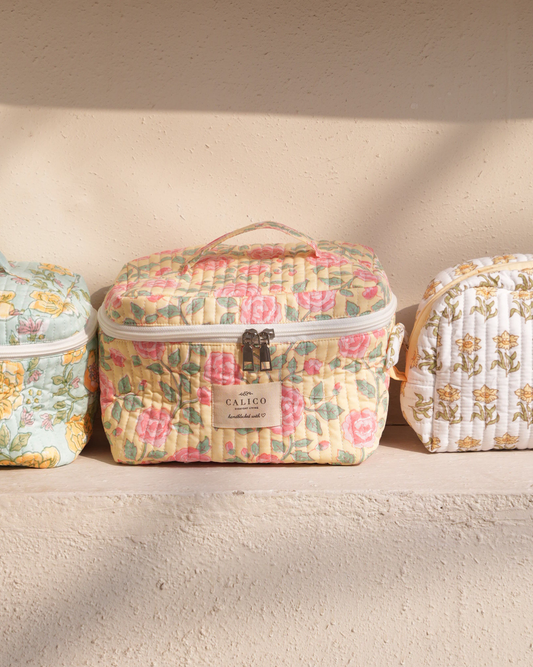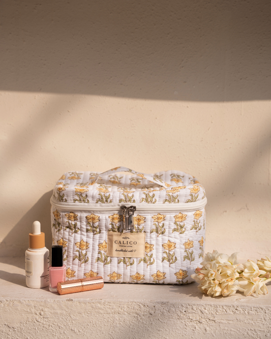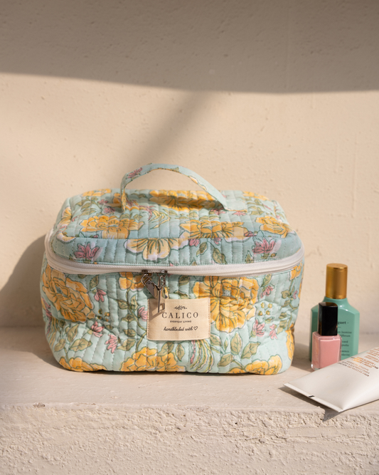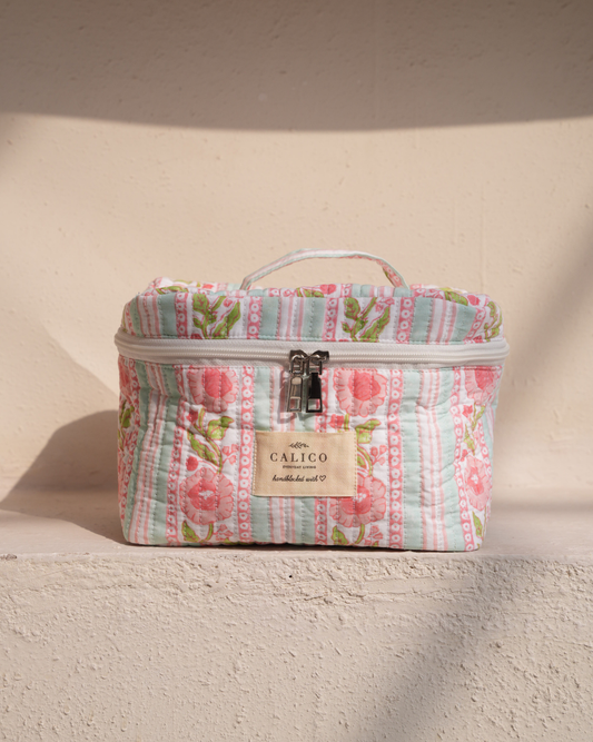 This beautifully designed vanity case features a charming block print fabric. The quilted fabric adds...