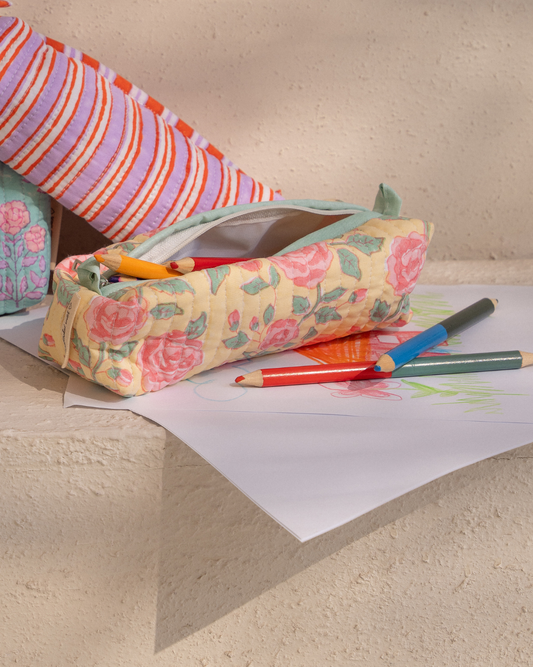 This adorable pencil case for kids showcase a hand-drawn block print design on a quilted...