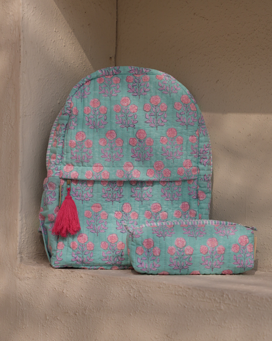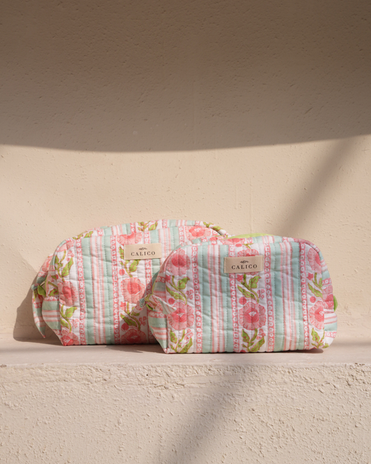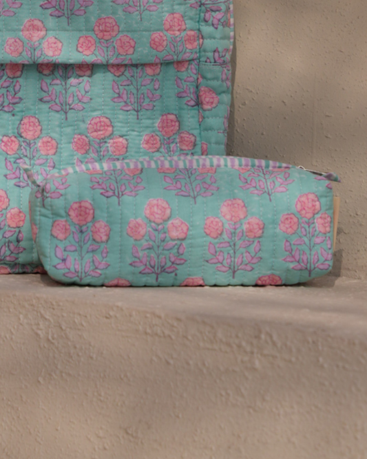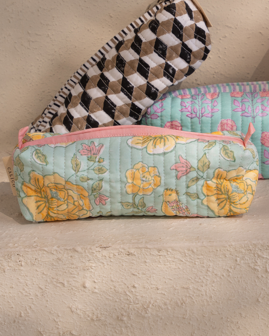 This set includes two quilted makeup/toiletry pouches, each featuring a charming blockprinted design. Both pouches...