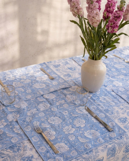 Delicately hand block printed tablecloth featuring blue floral and bird motifs on a white base....