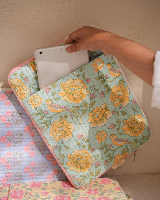 This block-printed quilted laptop sleeve combines style and function. Designed with soft cushioning for added...