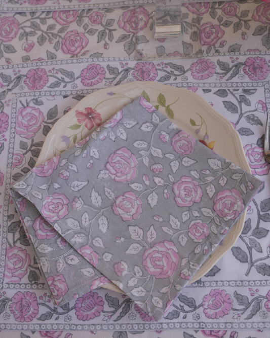 Delicately hand block printed napkins feature a mauve floral print on a greyish blue base....