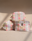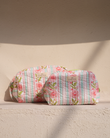 This set includes two quilted makeup/toiletry pouches, each featuring a charming blockprinted design. Both pouches are secured with a zip closure, enhanced by a decorative tassel for ease of access. Waterproof lining and smaller pockets on the inside make it perfect for organizing personal items. Perfect for travel or everyday use, these pouches combine functionality with style.