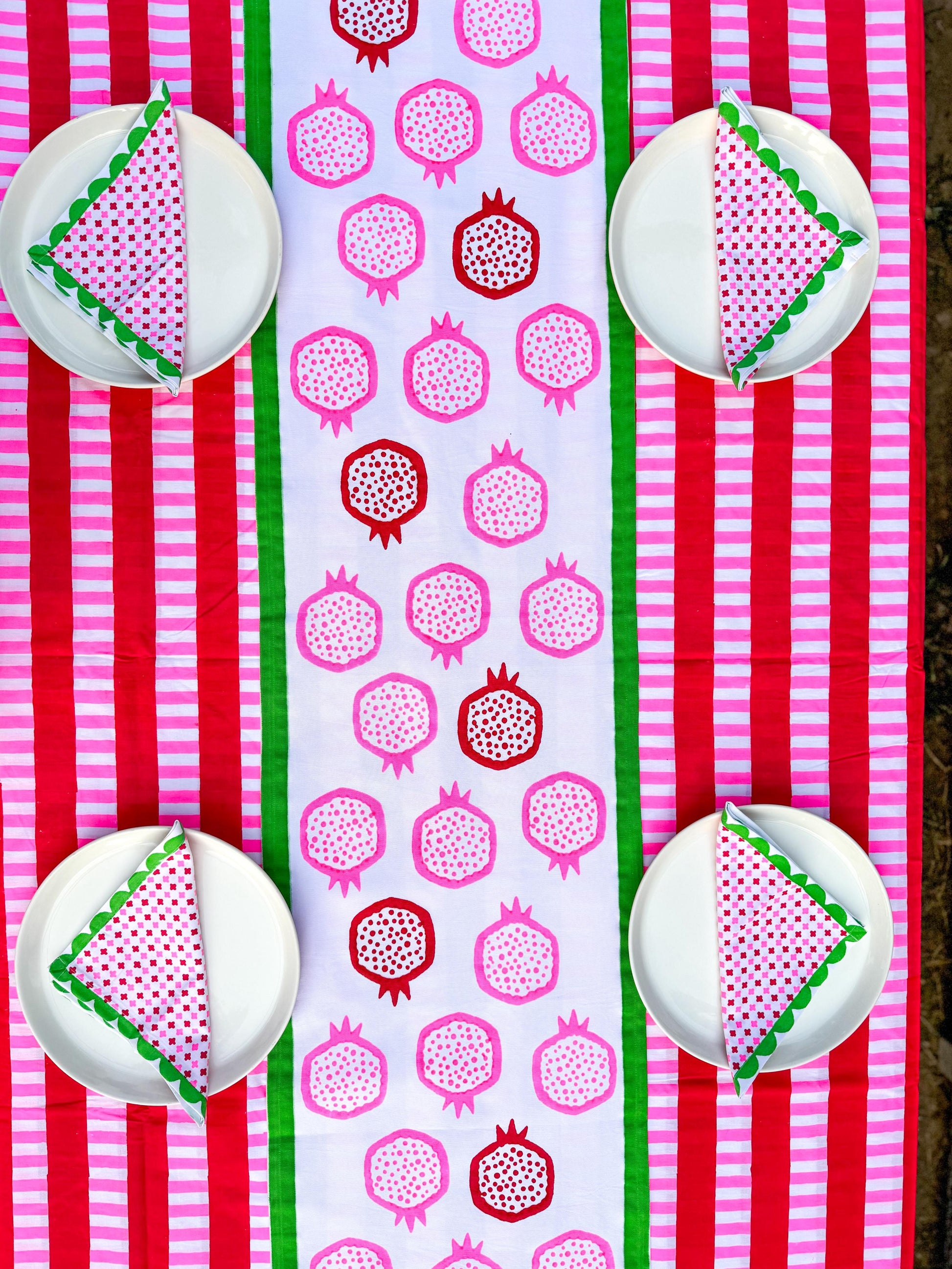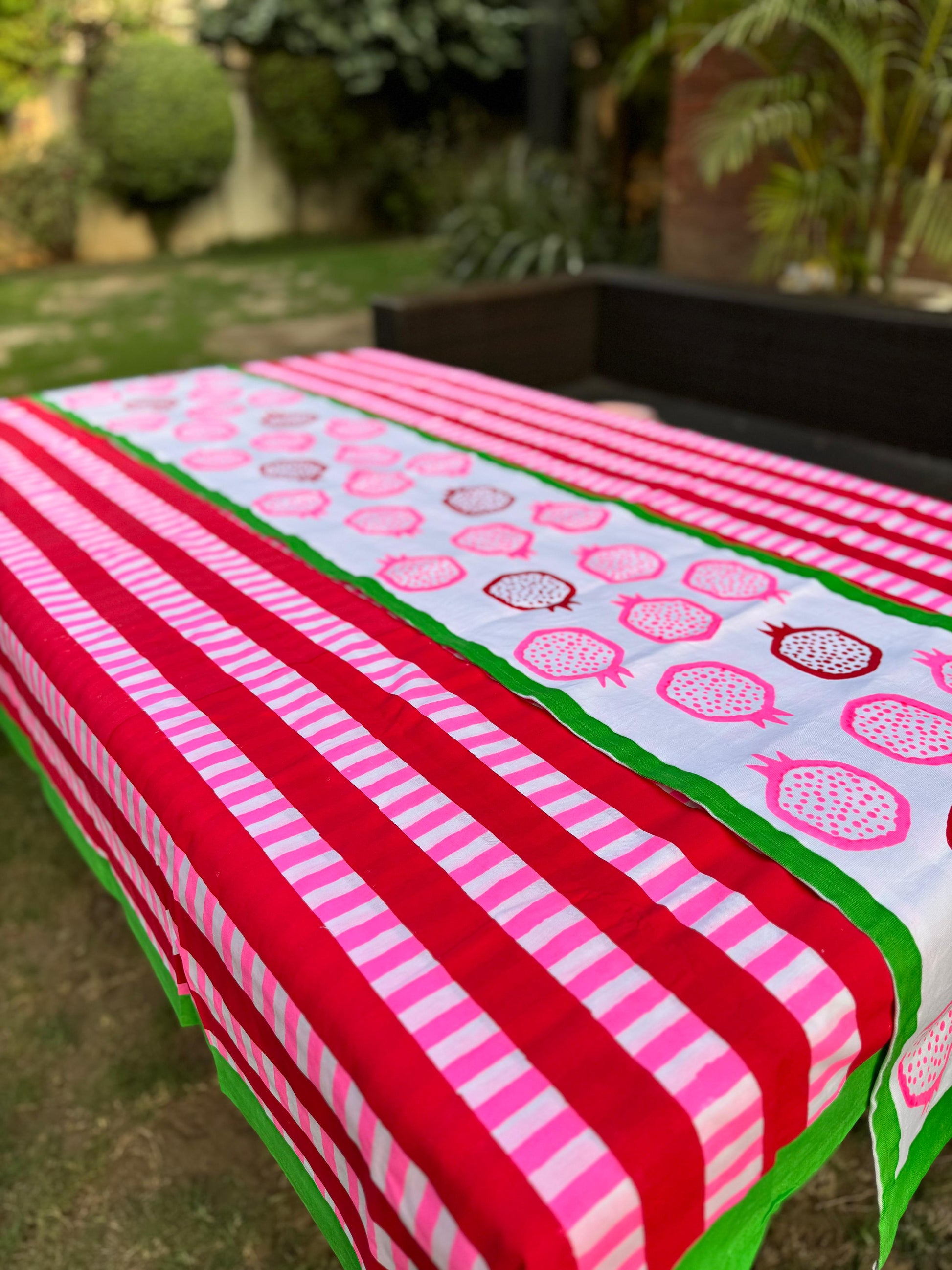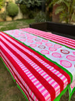 This tablecloth features bold stripes in alternating shades of deep red and bright pink, softened by narrow white lines that break up the pattern. The are framed by a vivid green border, adding a fresh contrast to the playful, candy like color palette. The overall look is a lively and cheerful, perfect for creating a a festive and modern table setting.